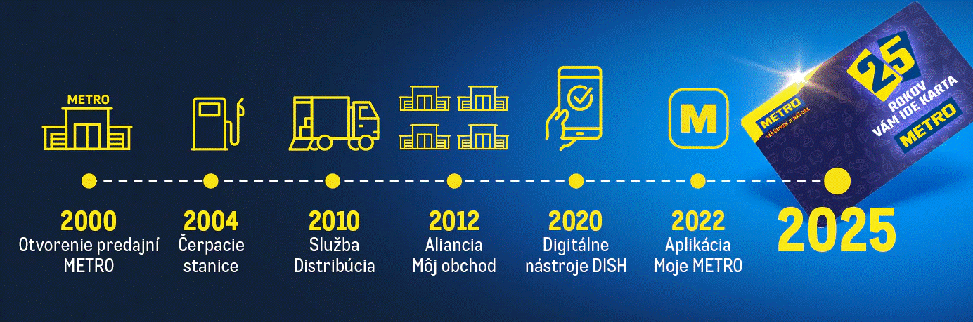 METRO vstúpilo na slovenský trh v novembri 2000, kedy otvorilo svoje veľkoobchodné predajne v Ivanke pri Dunaji, Nitre a Zvolene. Postupne sa otvárali ďalšie predajne v Košiciach, Žiline a Devínskej Novej Vsi. Za štvrťstoročie pôsobenia stálo METRO pri úspechu mnohých slovenských podnikateľov. Od prvých zákazníkov, ktorí prekročili prah predajní pred 25 rokmi, až po tisíce firiem, ktoré s ním spolupracujú dnes – všetci sú súčasťou príbehu, ktorý sa píše spoločne.