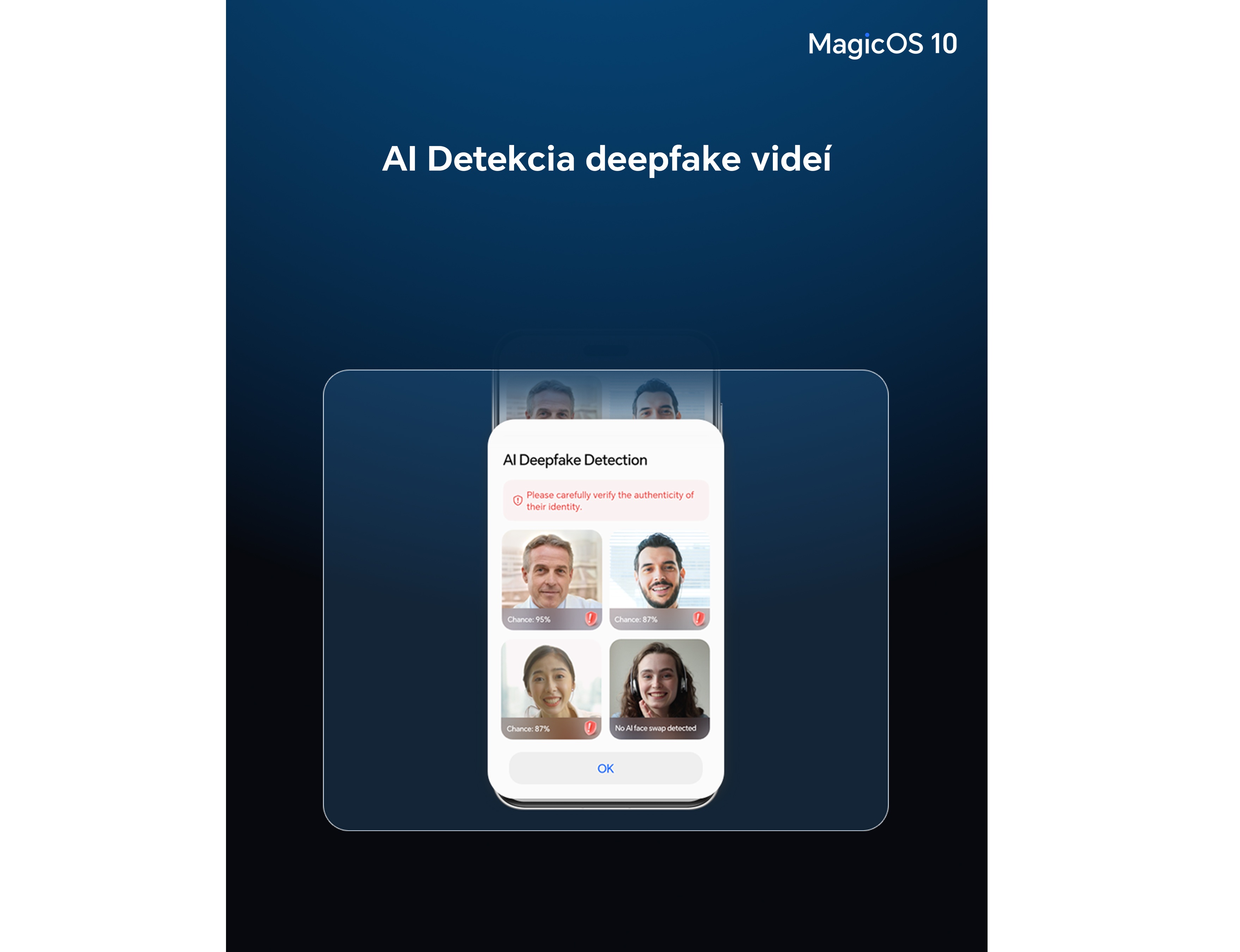 Z hľadiska bezpečnosti systém pridáva AI Detekciu deepfake videí, ktorá využíva inteligentnú analýzu na identifikáciu potenciálne zmanipulovaných médií a chráni používateľov napríklad počas videohovorov alebo pri zdieľaní obsahu.