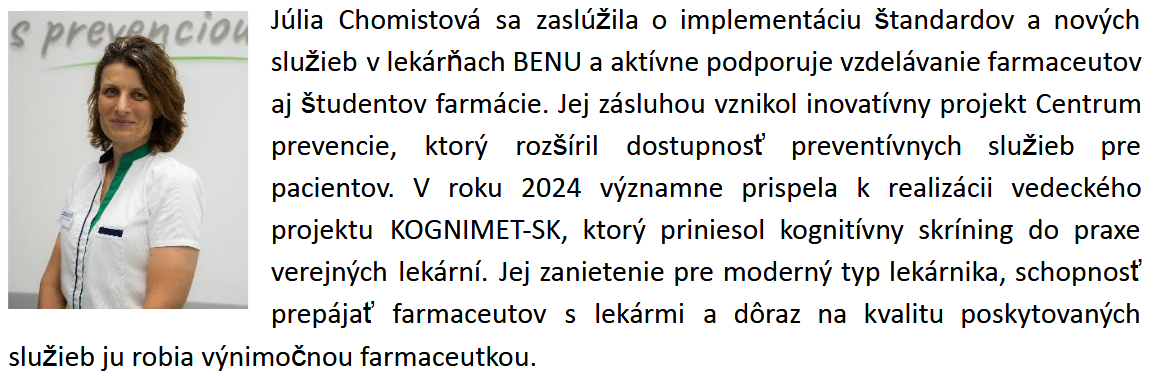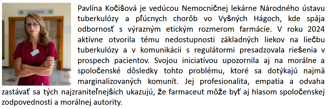 Okrem udelenia Ceny verejnosti pre lekárnickú osobnosť roka budú farmaceutky a farmaceuti ocenení aj v kategórii Lekárnická osobnosť roka - Cena odbornej poroty. Laureátov oboch ocenení spoznáme na galavečere, ktorý sa uskutoční 5. novembra 2025 v Bratislave.