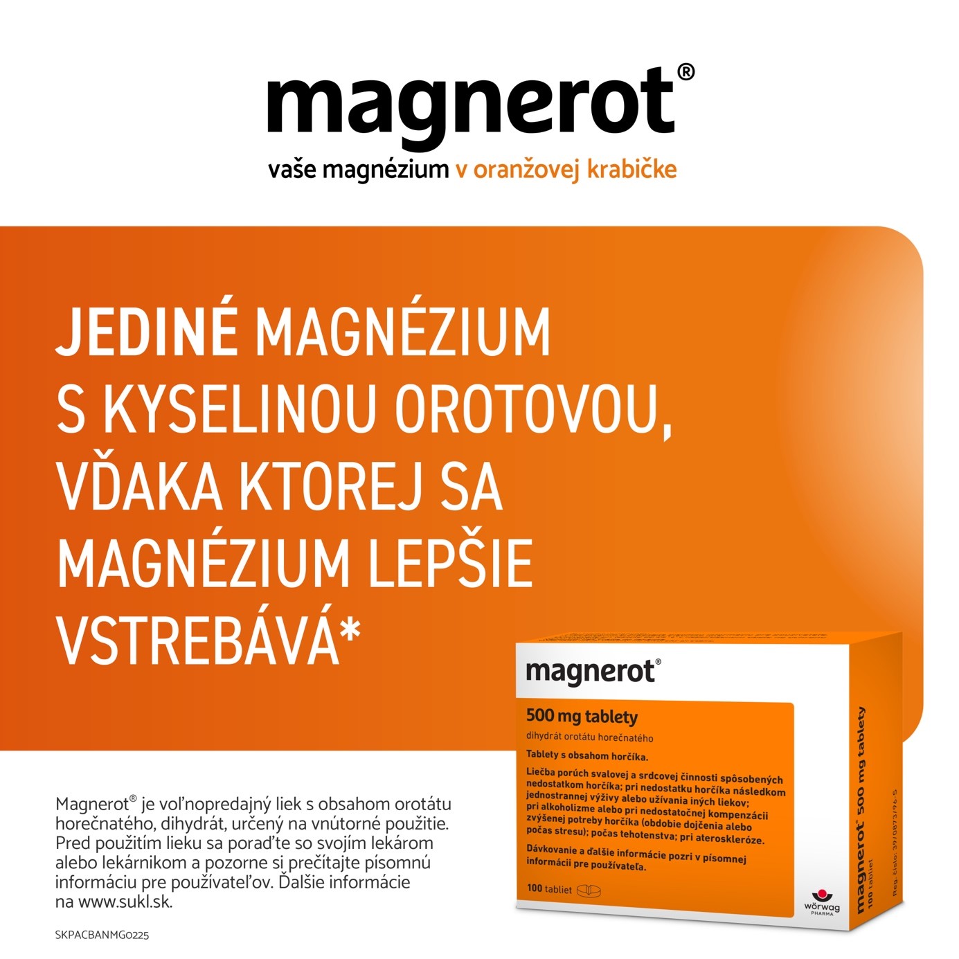 Magnerot® je voľnopredajný liek s obsahom orotátu horečnatého, dihydrát, určený na vnútorné použitie. Pred použitím lieku sa poraďte so svojím lekárom alebo lekárnikom a pozorne si prečítajte písomnú informáciu pre používateľov. Ďalšie informácie na www.sukl.sk.