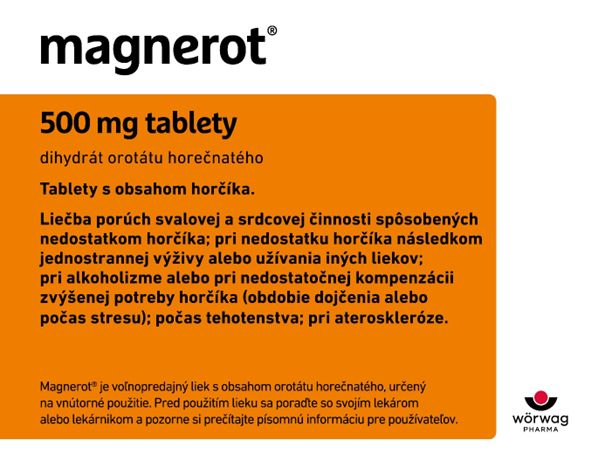 Magnerot® je voľnopredajný liek s obsahom orotátu horečnatého, dihydrát, určený na vnútorné použitie. Pred použitím lieku sa poraďte so svojím lekárom alebo lekárnikom a pozorne si prečítajte písomnú informáciu pre používateľov. Ďalšie informácie na www.sukl.sk.
